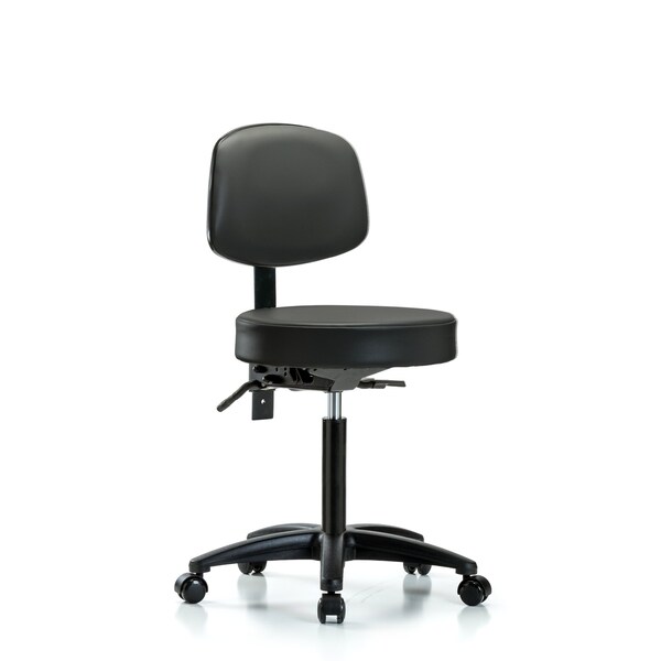 Vinyl Medium Bench Height Stool with Back is adjustable from 20.75-28.75 inches from the top of the seat to the floor and features ergonomic adjustments including seat height and locking back tilt and black, nylon-reinforced fiberglass base with dual-wheel, self-braking, non-marring casters suitable for hard floors in antibacterial/antifungal Carbon Supernova Vinyl.