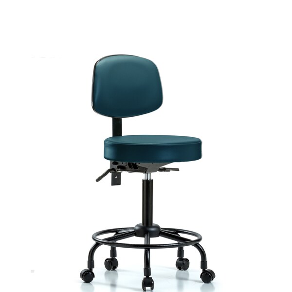 Vinyl Medium Bench Height Stool with Back & Round Tube Base is adjustable from 25.5-33 inches from the top of the seat to the floor and features ergonomic adjustments including seat height and locking back tilt and black, powder-coated base with fixed foot rings and dual-wheel, self-braking, non-marring casters suitable for hard floors in antibacterial/antifungal Marine Blue Supernova Vinyl.