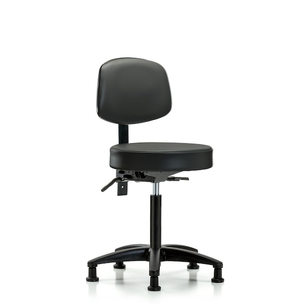 Vinyl Medium Bench Height Stool with Back is adjustable from 20.75-28.75 inches from the top of the seat to the floor and features ergonomic adjustments including seat height and locking back tilt, locking seat tilt, and black, nylon-reinforced fiberglass base with stationary, non-marring glides suitable for hard floors in antibacterial/antifungal Carbon Supernova Vinyl.