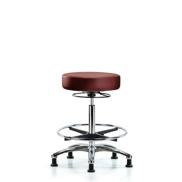 Vinyl High Bench Height Stool in Chrome is adjustable from 25.5-32.25 inches from the top of the seat to the floor and features ergonomic adjustments, including 360-degree, all-around control, chrome adjustable foot ring, and cast-aluminum base with stationary, non-marring glides suitable for hard floors in antibacterial/antifungal Borscht Supernova Vinyl.