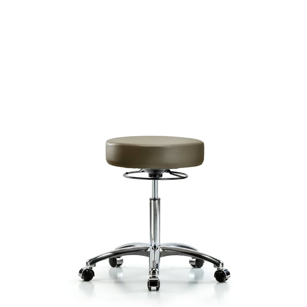 Vinyl Medium Bench Height Stool in Chrome is adjustable from 21.25-28.75 inches from the top of the seat to the floor and features ergonomic adjustments, including 360-degree, all-around control and cast-aluminum base with chrome-hooded, dual-wheel, self-braking, non-marring casters suitable for hard floors in antibacterial/antifungal Taupe Supernova Vinyl.