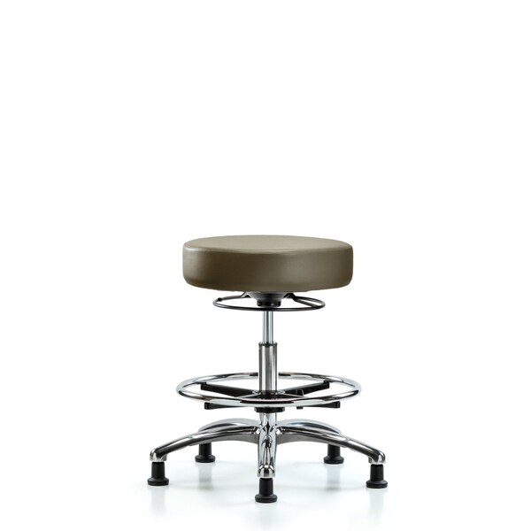 Vinyl Medium Bench Height Stool in Chrome is adjustable from 21.25-28.75 inches from the top of the seat to the floor and features ergonomic adjustments, including 360-degree, all-around control, chrome adjustable foot ring, and cast-aluminum base with stationary, non-marring glides suitable for hard floors in antibacterial/antifungal Taupe Supernova Vinyl.