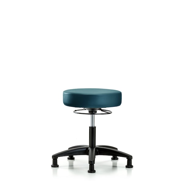 Vinyl Desk Height Stool is adjustable from 17.25-22.5 inches from the top of the seat to the floor and features ergonomic adjustments, including 360-degree, all-around control and black, nylon-reinforced fiberglass base with stationary, non-marring glides suitable for hard floors in antibacterial/antifungal Marine Blue Supernova Vinyl.