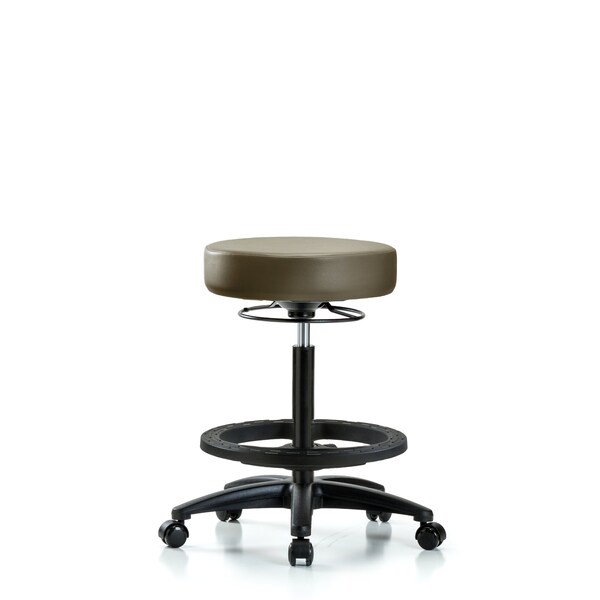 Vinyl High Bench Height Stool is adjustable from 24.5-34.5 inches from the top of the seat to the floor and features ergonomic adjustments, including 360-degree, all-around control, black nylon adjustable foot ring, and black, nylon-reinforced fiberglass base with dual-wheel, self-braking, non-marring casters suitable for hard floors in antibacterial/antifungal Taupe Supernova Vinyl.
