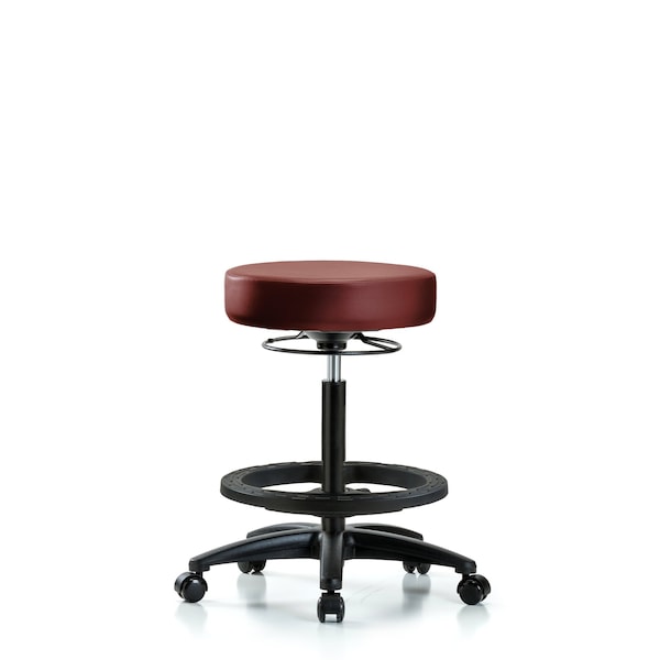 Vinyl High Bench Height Stool is adjustable from 24.5-34.5 inches from the top of the seat to the floor and features ergonomic adjustments, including 360-degree, all-around control, black nylon adjustable foot ring, and black, nylon-reinforced fiberglass base with dual-wheel, self-braking, non-marring casters suitable for hard floors in antibacterial/antifungal Borscht Supernova Vinyl.