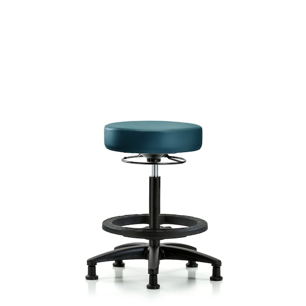 Vinyl High Bench Height Stool is adjustable from 24.5-34.5 inches from the top of the seat to the floor and features ergonomic adjustments, including 360-degree, all-around control, black nylon adjustable foot ring, and black, nylon-reinforced fiberglass base with stationary, non-marring glides suitable for hard floors in antibacterial/antifungal Marine Blue Supernova Vinyl.