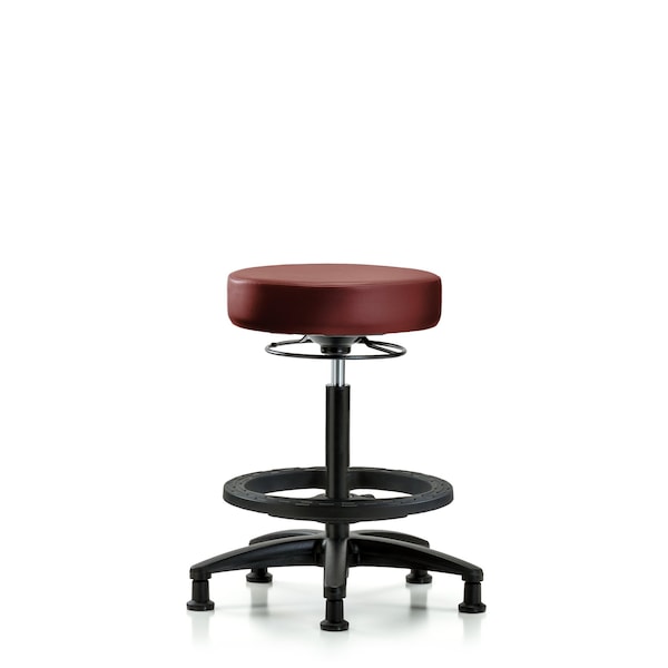 Vinyl High Bench Height Stool is adjustable from 24.5-34.5 inches from the top of the seat to the floor and features ergonomic adjustments, including 360-degree, all-around control, black nylon adjustable foot ring, and black, nylon-reinforced fiberglass base with stationary, non-marring glides suitable for hard floors in antibacterial/antifungal Borscht Supernova Vinyl.