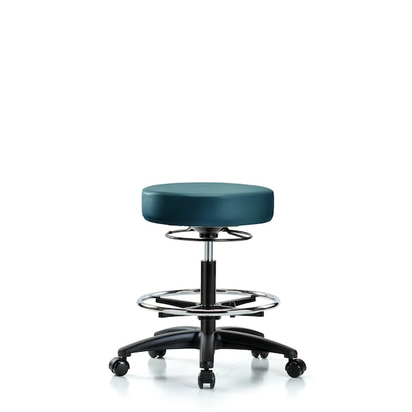 Vinyl Medium Bench Height Stool is adjustable from 19.75-27.25 inches from the top of the seat to the floor and features ergonomic adjustments, including 360-degree, all-around control, chrome adjustable foot ring, and black, nylon-reinforced fiberglass base with dual-wheel, self-braking, non-marring casters suitable for hard floors in antibacterial/antifungal Marine Blue Supernova Vinyl.