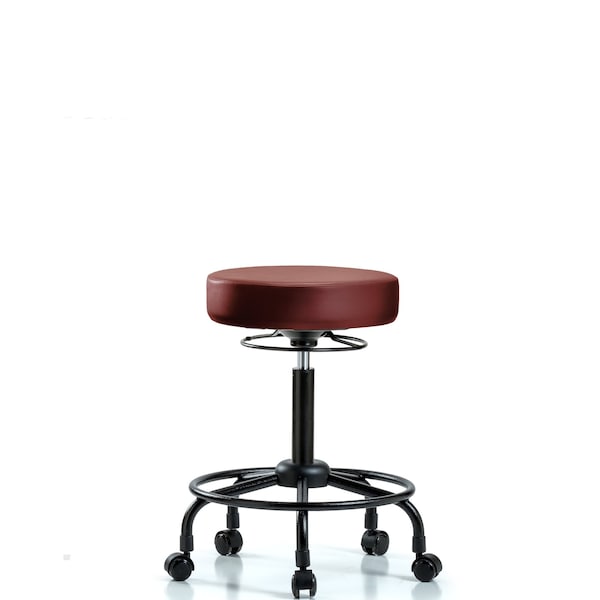 Vinyl Medium Bench Height Stool with Round Tube Base is adjustable from 24.5-32.25 inches from the top of the seat to the floor and features ergonomic adjustments, including 360-degree, all-around control and black, powder-coated steel base with fixed foot ring and dual-wheel, self-braking, non-marring casters suitable for hard floors in antibacterial/antifungal Borscht Supernova Vinyl.