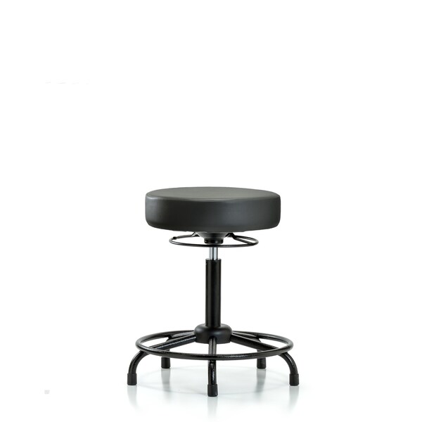 Vinyl Medium Bench Height Stool with Round Tube Base is adjustable from 24.5-32.25.25 inches from the top of the seat to the floor and features ergonomic adjustments, including 360-degree, all-around control and black, powder-coated steel base with fixed foot ring and stationary, non-marring glides suitable for hard floors in antibacterial/antifungal Carbon Supernova Vinyl.