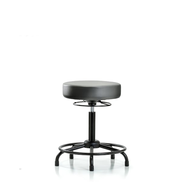 Vinyl Medium Bench Height Stool with Round Tube Base is adjustable from 24.5-32.25.25 inches from the top of the seat to the floor and features ergonomic adjustments, including 360-degree, all-around control and black, powder-coated steel base with fixed foot ring and stationary, non-marring glides suitable for hard floors in antibacterial/antifungal Sterling Supernova Vinyl.