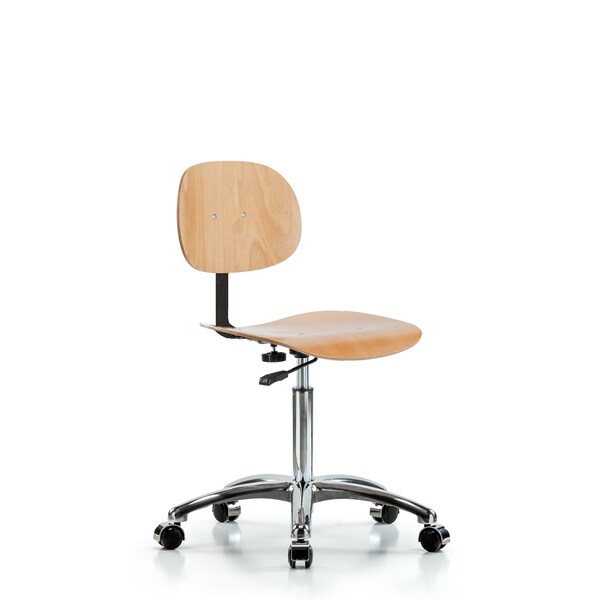Wood Medium Bench Height Chair in Chrome is adjustable from 19-26.75 inches from the top of the seat to the floor and features ergonomic adjustments such as seat height, manual back height and depth adjustments and cast-aluminum base with chrome-hooded, dual-wheel, self-braking, non-marring casters suitable for hard floors in a 7-ply furniture grade hard wood with natural finish.