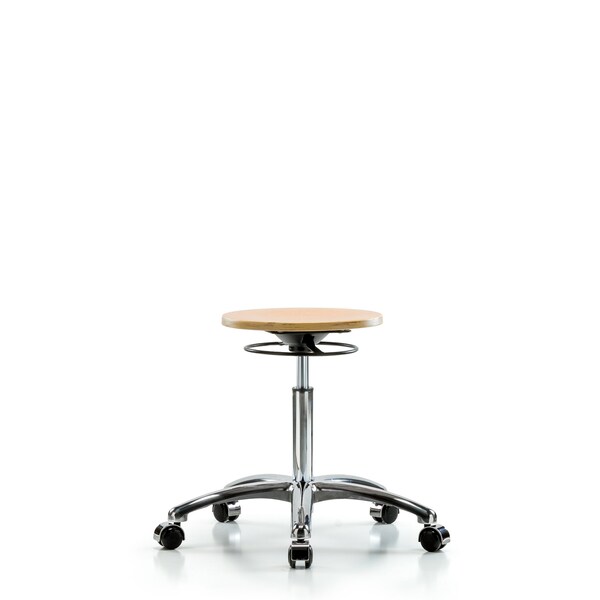 Wood Medium Bench Height Stool in Chrome is adjustable from 19-27 inches from the top of the seat to the floor and features 360-degree, all-around control and cast-aluminum base with chrome-hooded, dual-wheel, self-braking, non-marring casters suitable for hard floors in 7-ply furniture grade hardwood with natural finish.