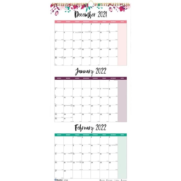 Track projects, create schedules, make daily notes or schedule vacations with this three-month wall calendar. It offers a quick view for advance planning up to three months and plenty of space to jot down important notes and reminders. Each page includes three full months along with other useful features. This three-month-per-page format includes daily unruled blocks, Sunday-through-Saturday scheduling, count of days/days remaining, moon phases and holidays. Dated planning pages range 12 months from December to January. Calendar also features reinforced backer and twin-wire binding with a hook for easy hanging. Calendar pages are printed in English.