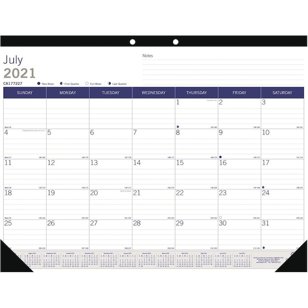 Stay organized with this helpful desk pad. Planning pages range 13 months from July to July. One-page-per-month format includes unruled daily blocks, Sunday-through-Saturday scheduling, count of days/day remaining, moon phases, holidays and a one-year reference calendar at the bottom. The notes section is at the top of each monthly page where you'll be sure to see your special reminders. Calendar sheets are bound at the top and perforated for easy tearing. Reinforced chipboard backer offers a reliable writing surface. Corners match the black headband and secure the planning pages. Desk pad is made from wood that came from a certified managed forest. High-quality paper is made mostly from a sugarcane stock called bagasse.