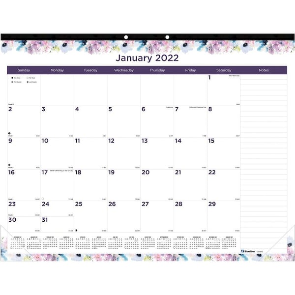 Passion Desk Pad will delight you with eye-catching, four-color Floral designs that change every four months to greet your planning every day. In addition to the four-color floral images, each monthly sheet features daily unruled blocks for flexible planning and reminders, Sunday-through-Saturday format, ruled notes section, numbered weeks, count of days/days remaining, moon phases, holidays and full-year calendar reference along the bottom. Dated planning pages range 12 months from January to December. They are bound at the top and tear off easily for a clear view of the next month. Clear vinyl corners on the bottom secure the sheets. Two eyelets in the top binding offer a versatile hanging option for space-constrained offices. Reinforced chipboard backer provides writing support. Large, FSC Certified pages are made with a high percentage of recycled fiber.