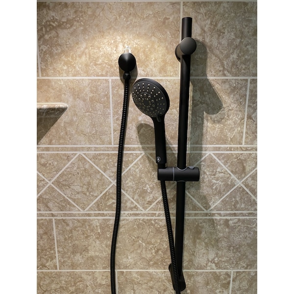 4.4 inch 5-F handheld shower with adjustable wall mount, 1.5M stainless steel shower hose with 2 metal end nuts. Includes check valve. Material: ABS Plastic. Color: Matte Black