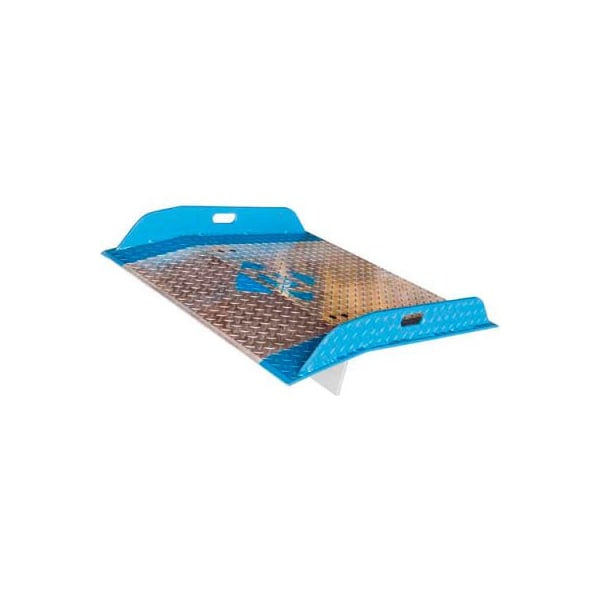 Bluff gas cylinder pallet ramp plate easily move industrial, medical and specialty gas cylinders on and off pallets. steel pallets are used in the gas cylinder distribution process to hold both filled and depleted cylinders. This unique plate provides an excellent transition surface for maneuvering cylinders with ease and control, significantly reducing cylinder damage and the risk of employee injury. 3/8" thick aluminum diamond plate construction is strong enough to accommodate heavy cylinders, yet lightweight for easy hand placement and portability. Ansi code and weight capacity is stamped onto the back of each plate. Note: not for use with powered vehicles. plate with curbs features 4"h run-off curbs on both sides for added cylinder control. Plate surface is 9"h and has an 11" entry lip for a smooth transition. Plate features hand-hole cutouts on the curbs for easy portability and bolt-on safety legs.