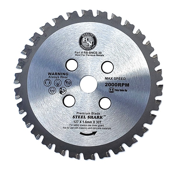 Circular Saw Blade, Blade Diameter 5 in, Arbor Size 1/2 in, Arbor Shape Round, Number of Teeth 30, Maximum Blade Speed 2,000 RPM, Maximum Cutting Depth 1 1/4 in, Primary Material Application Rebar, Tip Material Carbide Tipped, Cut Width 0.066 in, Metal Cutting Type Solid Stock, Thick Metal