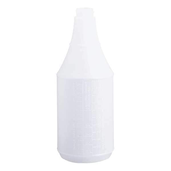 Clear bottle with embossed scale encourages user to properly proportion chemicals from larger containers and when mixed with water. Sleek, tapered neck bottle provides a more comfortable grip when used with a trigger sprayer. Easy-to-use, multi-purpose bottle for general-purpose cleaning in kitchens, bathrooms, offices, schools, and industrial settings. It securely holds cleaning solvents and water without spilling. Trigger sprayers sold separately.