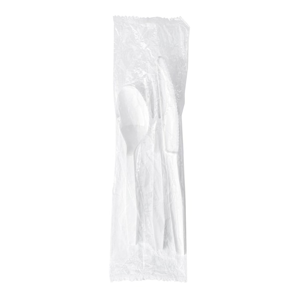 Serve virtually any meal with this cutlery kit. Each pre-packaged, cutlery wrapped kit contains a medium weight plastic fork, spoon, and knife. The convenient kits make set-up for an event or packing a to-go meal quick and easy. Individually packaged for convenience and to ensure utensils remain sanitary, even after handling. Perfect for outdoor gatherings, large parties, and take-out meals.