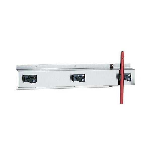 Mop & broom holder; 24 in (L) x 5 in (H); Satin finish stainless steel; (3) anti-slip mop holders have spring-loaded rubber cam that grips handles 7/8 in to 1 1/4 in diameter; Holds (3) mops 3 1/4 in away from the wall