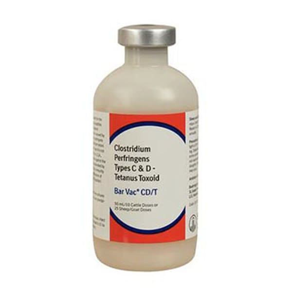 Bar-Vac CD/T is recommended for the immunization of healthy sheep, goats and cattle against enterotoxemia and tetanus caused by the toxins of Clostridium perfringens types C & D (overeating disease) and Clostridium tetani (tetanus.) Dosage is 2 ml for sheep and goats and 5 ml for cattle injected subcutaneously. Repeat in 21 to 28 days and an annual booster of Bar-Vac is recommended.