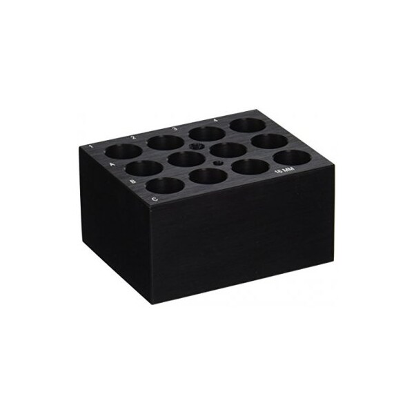 These precision machined solid aluminum blocks are meant to accommodate micro-centrifuge tubes, microplates and test tubes. Anodized blocks resist corrosion and feature alpha/numerical labeled rows and columns for easy vessel identification. Each block has a well for a thermometer sold separately and a block extractor hole.Block Modules can be used in either an analog or digital dry bath incubator.Product Dimensions centimeters: 5.1 x 9.5 x 7.6 Capacity: 12 x 16mm TubesShipping Weight: 1.5699 lbsShipping Dimensions: 4.50 x 3.00 x 2.00Research or further manufacturing use only, not for food or drug use.