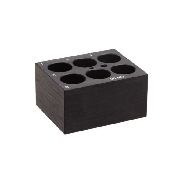 These precision machined solid aluminum blocks are meant to accommodate micro-centrifuge tubes, microplates and test tubes. Anodized blocks resist corrosion and feature alpha/numerical labeled rows and columns for easy vessel identification. Each block has a well for a thermometer sold separately and a block extractor hole.Block Modules can be used in either an analog or digital dry bath incubator.Product Dimensions centimeters: 5.1 x 9.5 x 7.6 Capacity: 6 x 25mm TubesShipping Weight: 1.5 lbsShipping Dimensions: 4.75 x 3.50 x 2.50Research or further manufacturing use only, not for food or drug use.