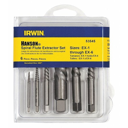 Screw Extractor Set, Spiral Flute, Size No. 1/No. 2/No. 3/No. 4/No. 5, 3/32" to 5/8" Capacity, 10Pcs