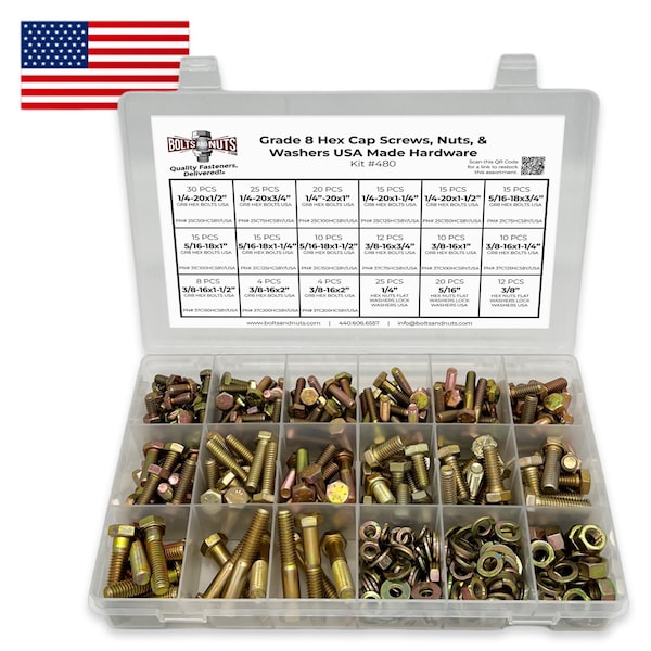 Inch Grade 8 Hex Cap Screws, Nuts, Flat & Lock Washers Zinc Yellow USA Made Hardware - 380 PCS