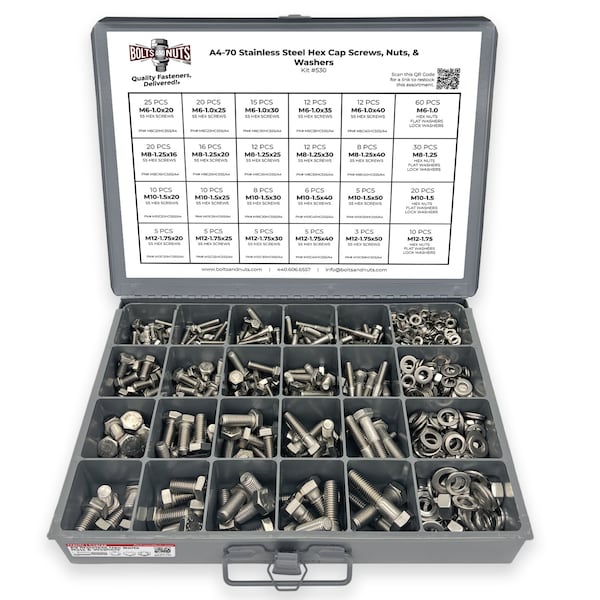 - • 575 Pieces - Metric Hex Cap Screws, Finished Hex Nuts, Flat Washers, and Lock Washers - A4-70 Stainless Steel Coarse Thread