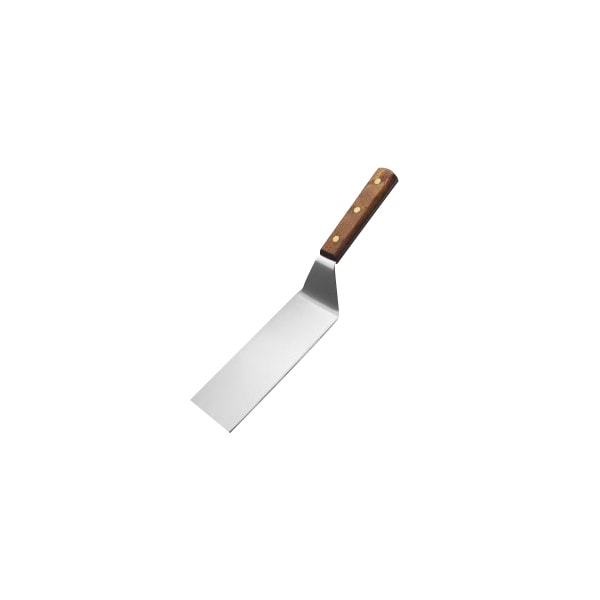 Stainless steel with hard wood handle; Square tipped ground edge scrapes material from container sidewalls; Offset handle to avoid scraped knuckles; 8" long x 2" wide; High quality at an affordable price; Expertly made from premium materials; Built to match your exact requirements