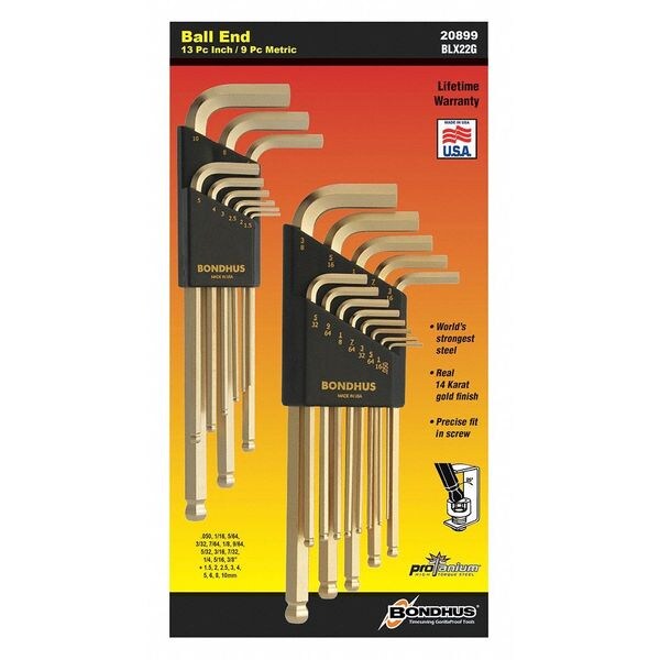 The Bondhus BLX22G 22 Piece L-Shape Hex Key Set offers a comprehensive range of hex keys for tackling various fasteners. These ball end hex keys can be used across an extensive range of applications and product categories. The set comprises L-shaped hex keys that can reach into tight spots and provide control when needed. Each long arm hex key is made of vanadium molybdenum high torque industrial strength tool metal, which provides exceptional strength. Their blue color helps to easily identify the size of each key in low light conditions. These hex keys are resistant to corrosion, rust and wear due to their protective coating, which ensures long life. Whether you are a professional or hobbyist, you will definitely want to equip yourself with the Bondhus BLX22G 22 Piece L-Shape Hex Key Set.