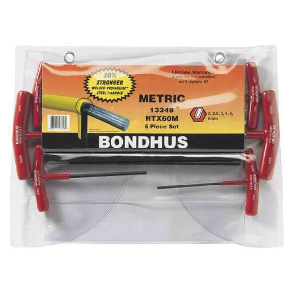 Bondhus' 13348 6 Piece Metric T-Shape Hex Key Set offers a comprehensive range of hex keys for tackling various fasteners. These metric hex keys can be used across an extensive range of applications and product categories. This hex key set comes in a standard tool kit that helps to keep the tools neat and tidy. The set comprises T-shaped hex keys that can reach into tight spots and provide control when needed. Each long arm hex key is made of steel with a ProGuard finish, so it will not corrode or rust easily. Their T-shaped handles provide better grip, especially in wet conditions. These hex keys are available in 2mm, 2.5mm, 3mm, 4mm, 5mm and 6mm sizes to meet your needs for a wide variety of applications. Whether you are a professional or hobbyist, you will definitely want to equip yourself with Bondhus' 13348 6 Piece Metric T-Shape Hex Key Set.