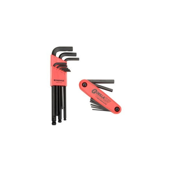 BONDHUS 14187 & 14189 BONUS PACK - BALLDRIVER L-WRENCH SET & GORILLA GRIP FOLD-UP SET BONUS DOUBLE PACK (#14187) INCLUDES: BALLDRIVER® TIP, LONG ARM, HEX KEY L-WRENCH 9PC SET W/PROGUARDTM FINISH PACKAGED IN BONDHEXTM COLOR CODED CASE AND A GORILLAGRIP® HEX TIP FOLD UP 7 PC TOOL, COLOR CODED, W/PROGUARDTM FINISH. BALLDRIVER® TIP, LONG ARM, HEX KEY L-WRENCH SET INCLUDES SIZES: 1.5MM, 2MM, 2.5MM, 3MM, 4MM, 5MM, 6MM, 8MM & 10MM. GORILLAGRIP® HEX TIP FOLD UP 7 PC TOOL SIZES INCLUDED: 2MM-8MM. BONUS DOUBLE PACK (#14189) INCLUDES: BALLDRIVER® TIP, LONG ARM, HEX KEY L-WRENCH 13PC. SET W/PROGUARDTM FINISH. PACKAGED IN BONDHEXTM COLOR CODED CASE AND A GORILLAGRIP® HEX TIP FOLD UP 9 PC TOOL, COLOR CODED, W/PROGUARDTM FINISH. BALLDRIVER® TIP, LONG ARM, HEX KEY L-WRENCH 13PC. SET INCLUDES SIZES: .050", 1/16", 5/64", 3/32", 7/64", 1/8", 9/64", 5/32", 3/16", 7/32", 1/4", 5/16" & 3/8"GORILLAGRIP® HEX TIP FOLD UP 9 PC TOOL INCLUDES SIZES: 5/64"-1/4".