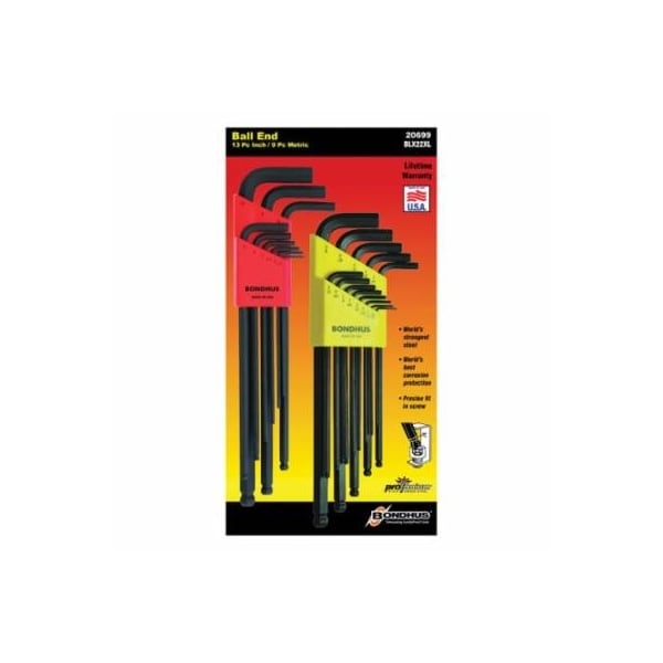 BONDHUS 20699 EXTRA LONG KEY SET, 22 PIECES, 0.05 TO 3/8 IN, 1.5 TO 10 MM HEX, L-HANDLE, PROTANIUM HIGH TORQUE STEEL, PROGUARD