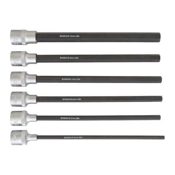 When you are looking for a complete set of hex end socket bits, this Bondhus 6 pcs Hex End Socket Bit Set is the perfect choice. This 6 piece bit set has all the sizes you need to tackle most projects around the house and shop. The size range covers 4mm to 10mm, making it compatible with most fasteners on the market today. The metric hex end socket bits have a standard tool and offer an overall length of 6". This bit set comes with six different styles of standard sockets so you can choose which one fits your application best. When you need a complete set of hex end socket bits that will meet your needs, this Bondhus 6 pcs Hex End Socket Bit Set is just what you're looking for.