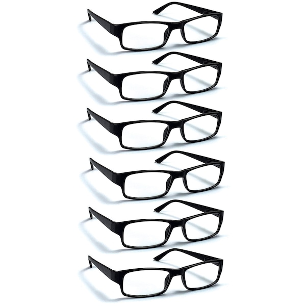 6 pairs of black-framed reading glasses with the same for all 6 pairs. Keep one pair in every room of the house, at work, in your car's glove box, or in your purse, backpack, or carry all to have handy when and where you need them. Shatter-resistant polycarbonate frames AND lenses for long-lasting wear, clarity, and UV-filtering. Lightweight, stylish, and durable, these glasses provide the vision boost you need without a doctor's prescription. Classic black frames to match any outfit and complement any face. Spring-loaded temple hinges for a comfortable fit, easy placement, and removal. No pinching and no added stress on glass temples. SPECIFICATIONS: Total width: 133mm/5.24in. Lens width: 55mm/2.17in. Lens height: 30mm/1.18in. Bridge width: 16mm/0.63in. Temple length: 105mm/4.13in. from lens to curvature