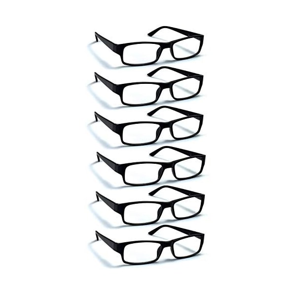 6 pairs of black-framed reading glasses with the same for all 6 pairs. Keep one pair in every room of the house, at work, in your car's glove box, or in your purse, backpack, or carry all to have handy when and where you need them. Shatter-resistant polycarbonate frames AND lenses for long-lasting wear, clarity, and UV-filtering. Lightweight, stylish, and durable, these glasses provide the vision boost you need without a doctor's prescription. Classic black frames to match any outfit and complement any face. Spring-loaded temple hinges for a comfortable fit, easy placement, and removal. No pinching and no added stress on glass temples. SPECIFICATIONS: Total width: 133mm/5.24in. Lens width: 55mm/2.17in. Lens height: 30mm/1.18in. Bridge width: 16mm/0.63in. Temple length: 105mm/4.13in. from lens to curvature