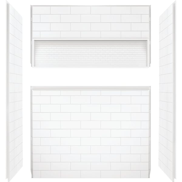 Composite direct-to-stud alcove subway tile shower wall kit. Features subway tile design and realistic grout texture without the upkeep or high price tag. Quick 1-person direct-to-stud installation. The connection system locks firmly in place. Water-tight assembly and no caulk required. Includes a recessed shelf that can be personalized with tile for a personal touch. Forever grout means no need to scrub or repair. Grout-free panels in glossy composite material are simple to clean and maintain. Shower base not included.