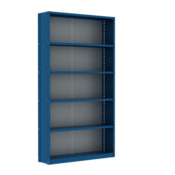 The Box Edge Closed No Back 6 Shelves Adder Unit P2 is 87"H x 48"W x 12"D and constructed of 20 gauge steel. It consists of posts, shelves and sway braces for added stability. The units give row ends a more finished appearance and are often combined in back-to-back installations or used alone along walls.