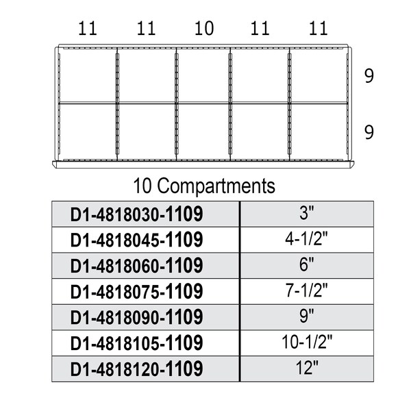 Borroughs DIS Drawer 10 Compartment Pre-Configured Drawer Interior, 9"H x 48"W x 18"D. The part number includes: drawer(s), slides, partitions and dividers.