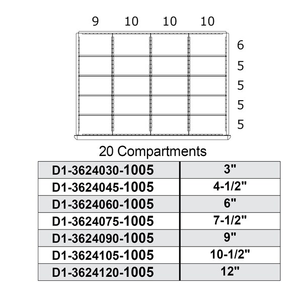 Borroughs DIS Drawer 20 Compartment Pre-Configured Drawer Interior 1, 9"H x 36"W x 24"D. The part number includes: drawer(s), slides, partitions and dividers.