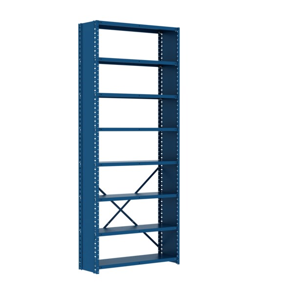 The Box Edge Closed 8 Shelves Adder Unit P2 is 87"H x 36"W x 18"D and is constructed of 20 gauge steel. It consists of posts, shelves and sway braces and is ideal for general purpose storage. These units give row ends a more finished appearance and are a perfect solution for storing loose parts.