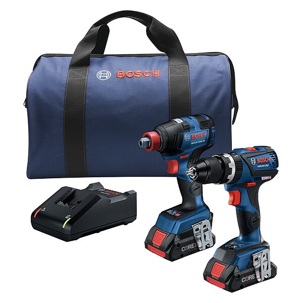 Cordless Combination Kit, Cordless Tools Included Hammer Drill, Impact Driver, Voltage 18 V DC, Power Source Cordless, Number of Tools 2, Battery Capacity (2) 4.0 Ah, Includes 4x Bit Holders, Belt Clip, Bits, Tool Brand Bosch, Series GXL, Battery Included Yes, Number of Batteries Included 2, Battery Model No. (2) 55EX99, Battery Series CORE18V(R), Charger 328YJ7, Charger Included Yes, Cordless Tool Kit Contents (2) Bare Tools, (2) Batteries, (1) Charger