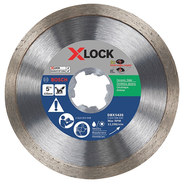 Diamond Saw Blade, Blade Dia. 5 in, Arbor Size 7/8 in, Arbor Shape X-Lock, Max. Blade Speed 11,000 RPM, Max. Saw Power 10 hp, For Use With Saw Type Angle Grinders, Cutting Type Wet/Dry, Rim Type Continuous, Max. Cutting Depth 1 1/2 in, Primary Material Application Concrete, Materials Cut Ceramic, Stone Tile, For Use On Concrete Type Hard Aggregate, Blade Thickness 0.063 in, Cut Width 0.875 in