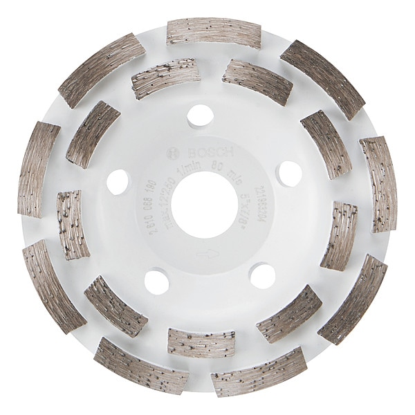 Diamond Cup Wheel, Abrasive Material Diamond, Connector Size 7/8 in, Connector Type Unthreaded Hole, Compatible Tool Type Angle Grinder, Primary Material Application Concrete, Grade Coarse, Number of Segments 18, Overall Diameter 5 in, Segment Design Double Row, Maximum Operating Speed 13,200 RPM, Overall Thickness 3/4 in
