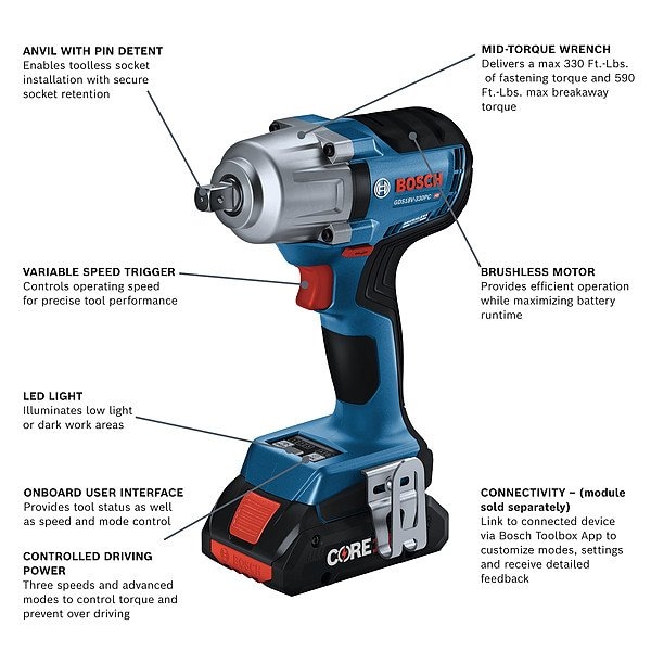 Impact Wrench, Drive Size 1/2 in, Voltage 18 V DC, Brushless Motor Yes, Handle Type Pistol Grip, Battery Capacity Not Applicable, Tool Weight 3.5 lb, Features Advanced Modes - Offer Preset and Customizable Modes such as Auto Stop, to Help Prevent over Driving, which can Damage Materials and Fasteners, Pin Detent System - Enables Toolless Socket Installation with Secure Socket Retention, Includes Belt Clip