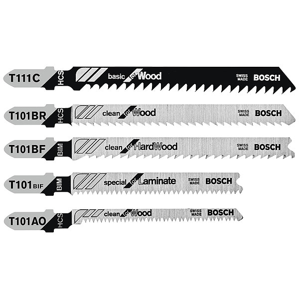 Jigsaw Blade, Blade Shank Type T Shank, Primary Material Application Wood, Teeth per Inch 10, 14, 20, 8, Blade Length 3 in, 3 1/4 in, 4 in, Cutting Edge Style Rigid for Straight Cuts, Blade Width Not Applicable, Metal Cutting Type Solid Stock, Blade Thickness 0.04 in, Materials Cut Laminates, Wood, Tip Material Not Applicable, Blade Material Bi-Metal, High Speed Steel, High Carbon Steel, For Use With Saw Type Jig Saws, Number of Pieces 5, Package Quantity 5